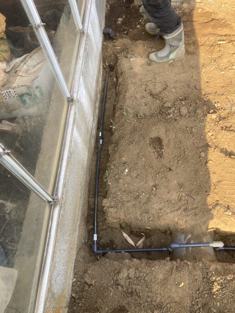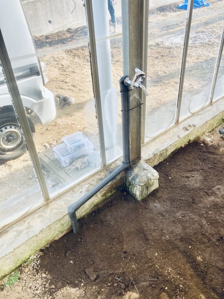 温室内に『簡易立水栓設置と加工室までの配管』をご要望通りに施工いたしました。