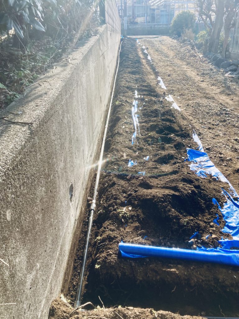 ご利用の畑の給水管(かなり広範囲に埋設配管されている)での漏水があり、給水管もかなり長期的にご使用されている為、範囲を狭めてメインにご使用される温室へのみの給水管配管をしてほしいと言うご依頼でした。